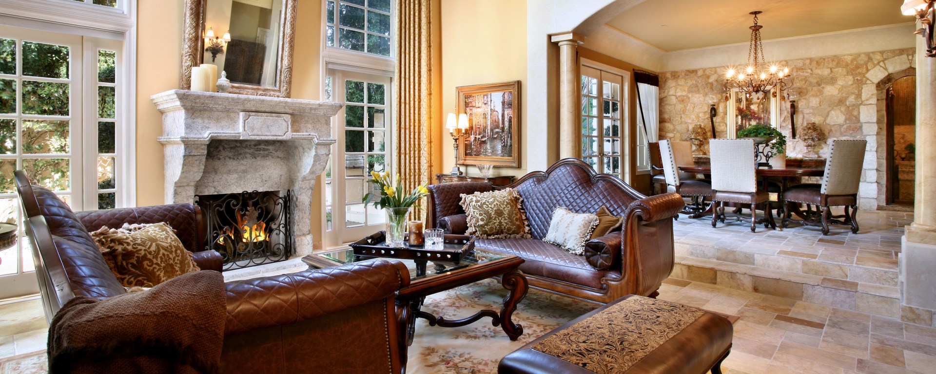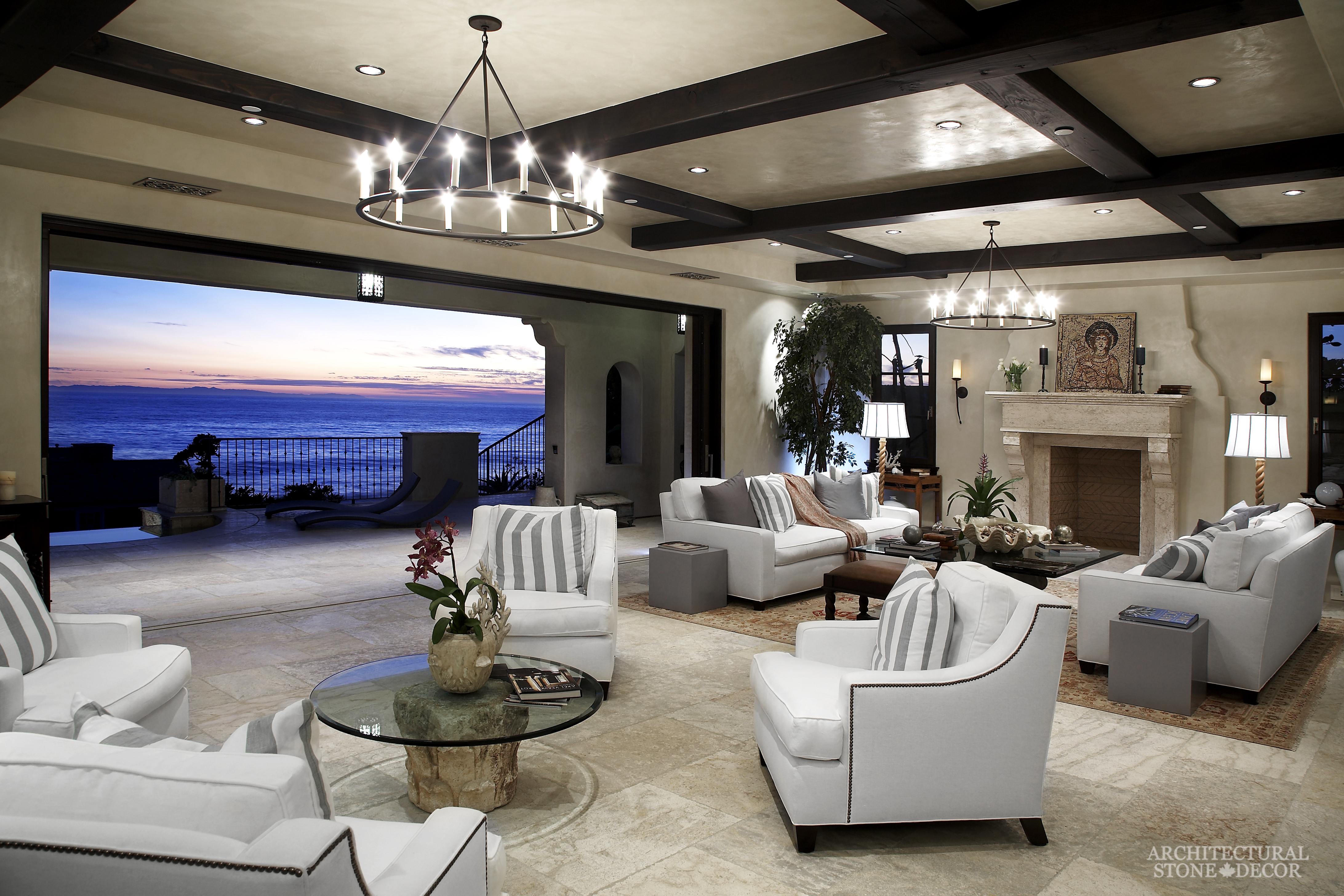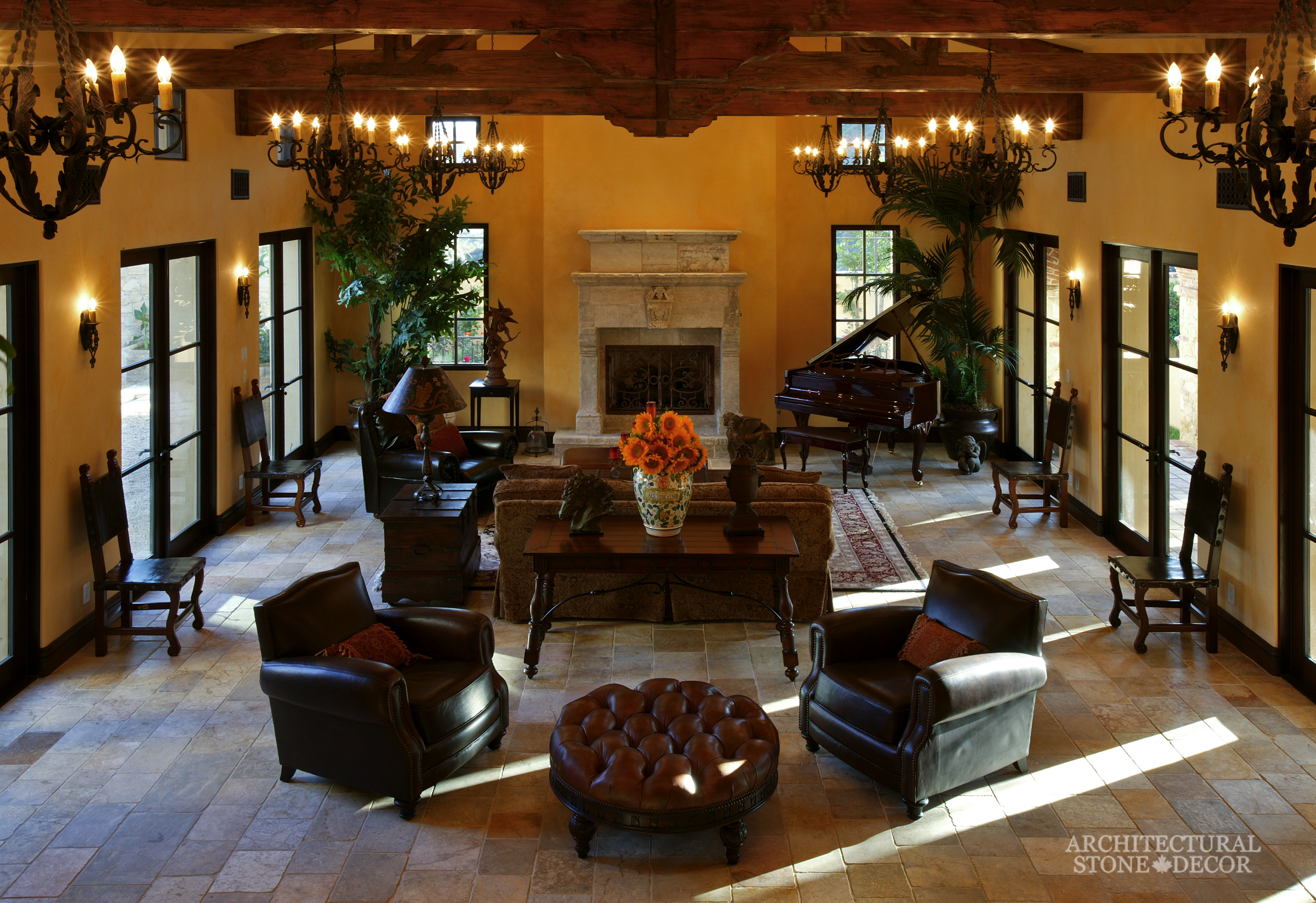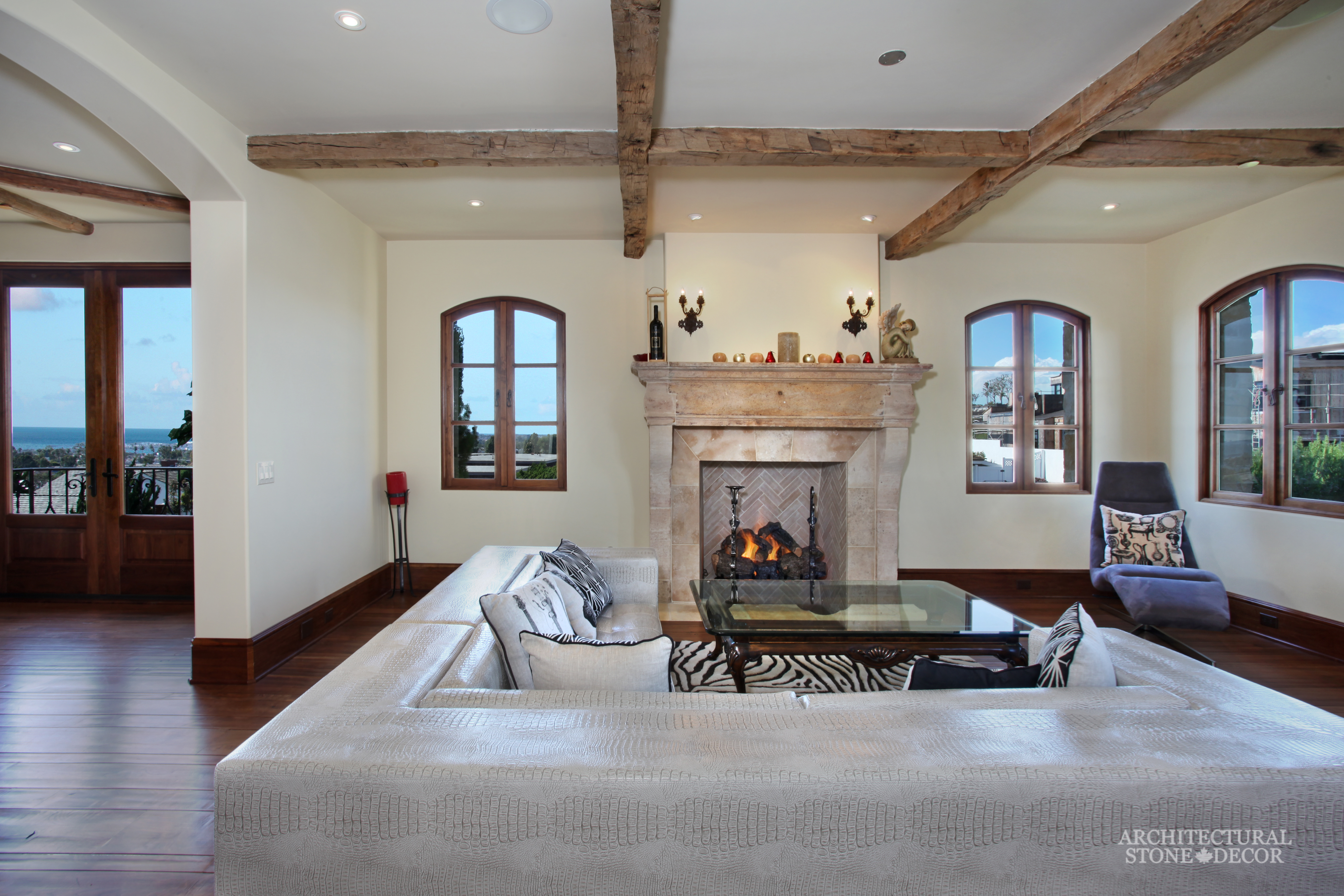 You don’t have to own an ancient home with old stone walls to conquer this style. You can accentuate the rustic character of your modern home by adding natural reclaimed architectural details such as exposed reclaimed wood beams on your ceiling, bare limestone wall cladding and flooring and hand carved natural limestone fireplaces adorning your family room, dining room, bedroom and even patio.