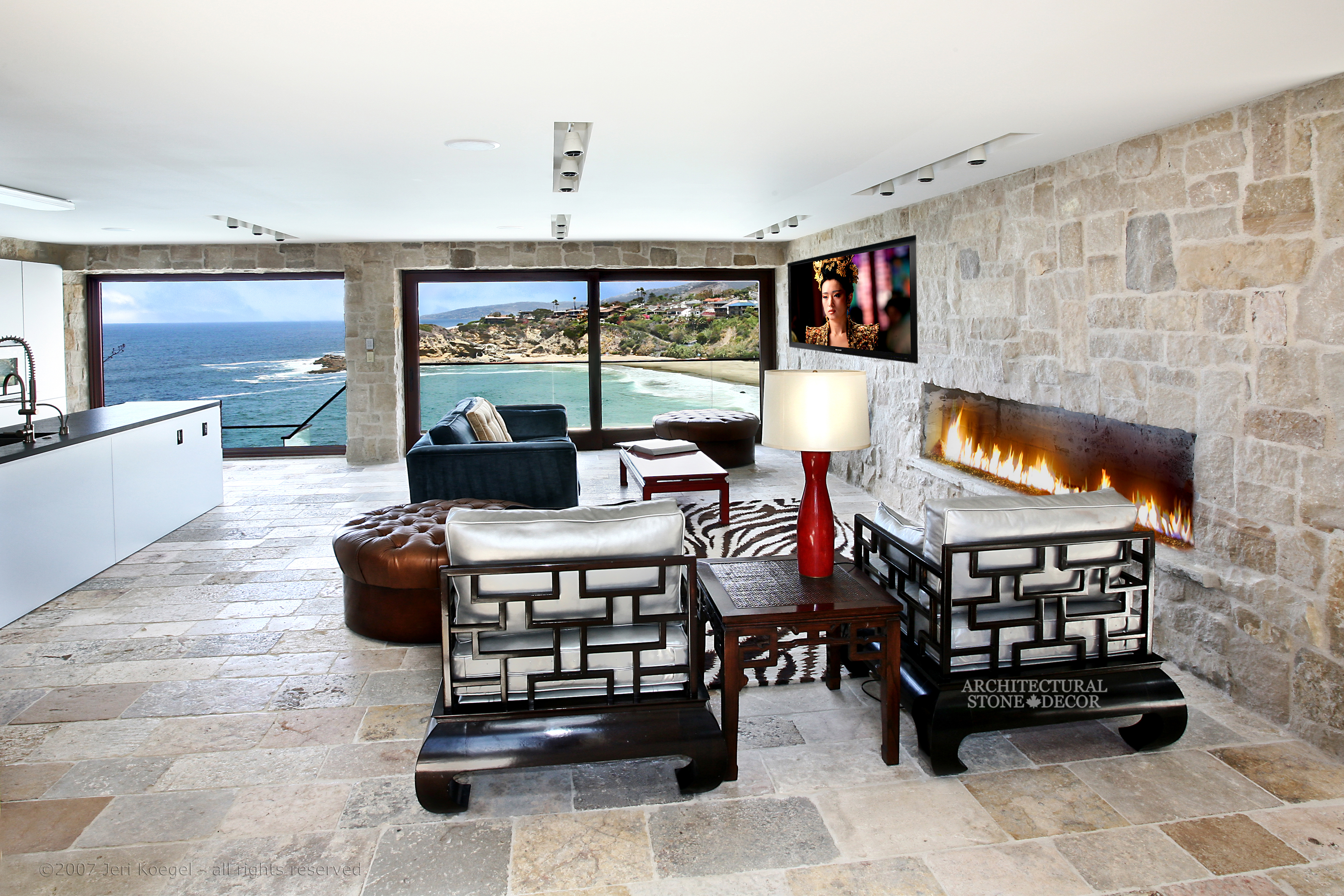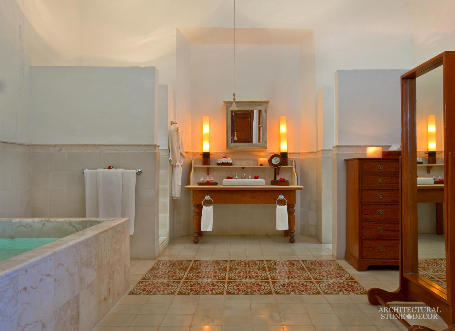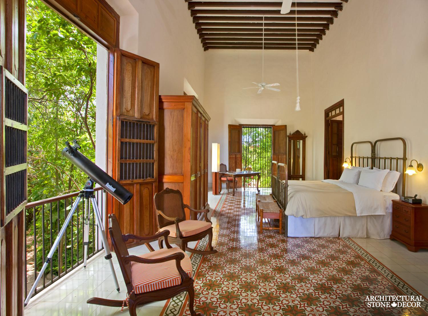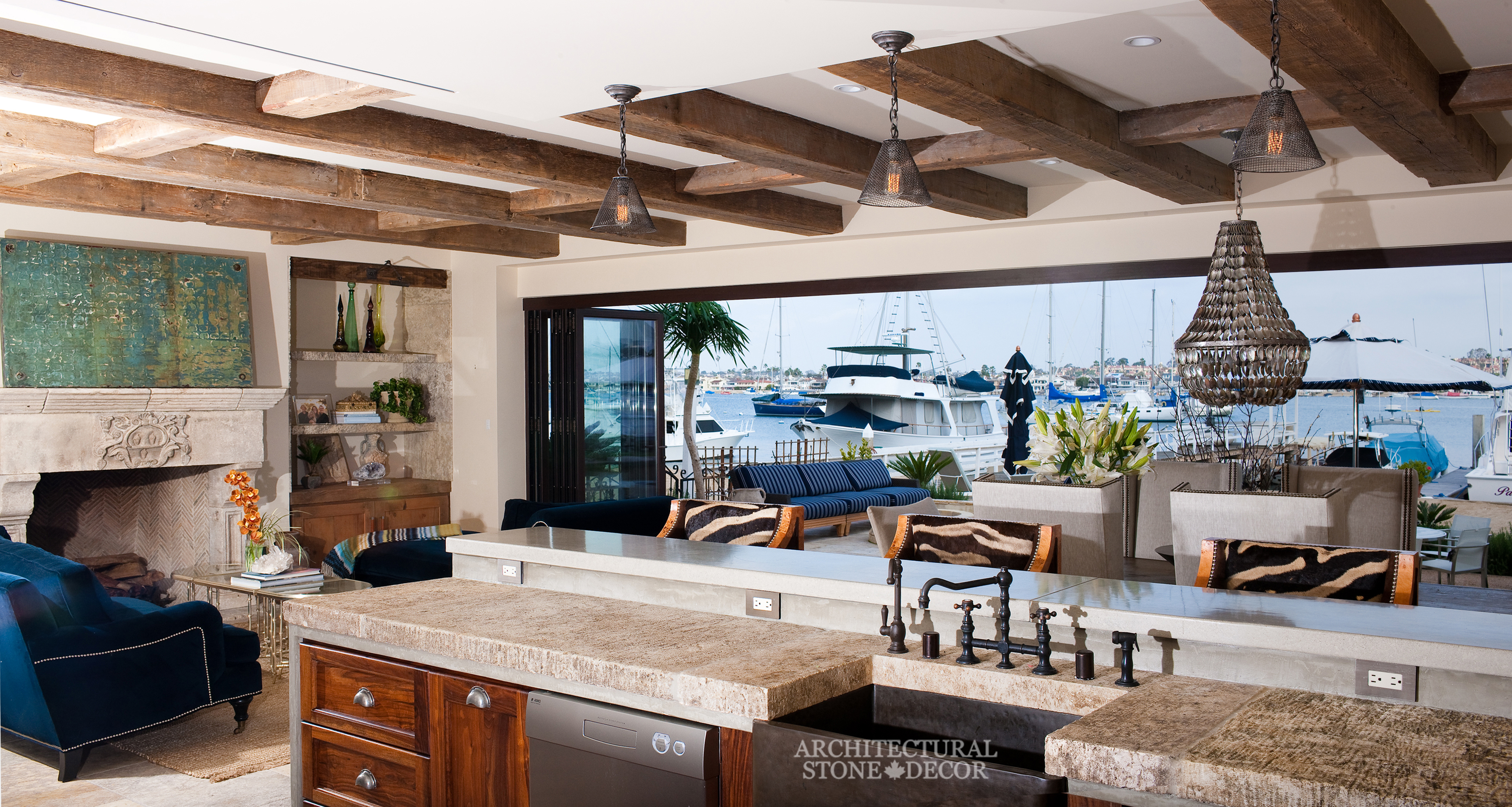 You don’t have to own an ancient home with old stone walls to conquer this style. You can accentuate the rustic character of your modern home by adding natural reclaimed architectural details such as exposed reclaimed wood beams on your ceiling, bare limestone wall cladding and flooring and hand carved natural limestone fireplaces adorning your family room, dining room, bedroom and even patio.