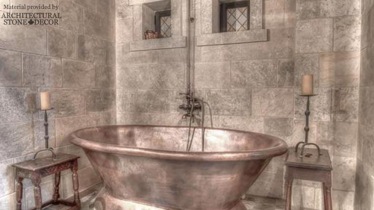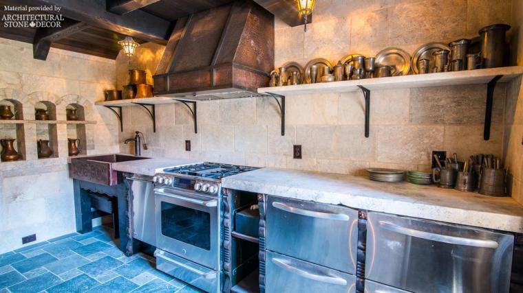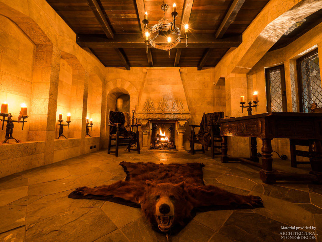 The castle’s Gothic Medieval Style living room with a reclaimed limestone hand-carved fireplace mantel, ‘Barre Montpelier’ wall cladding, rustic leather furniture, medieval paintings and weathered wood beams and furnitureA cozy Medieval living room/ study area with a hand carved reclaimed limestone fireplace mantel and overhead mantel piece. The ‘Barre Montpelier’ limestone wall cladding and corners define the room’s warmth and the wood ceiling beams, rustic furniture, chandelier and old bear rug add to the rustic feel.One of the Gothic styled rooms with a reclaimed hand carved limestone medieval fireplace mantel and ‘Barre Montpelier’ wall cladding and ‘Dalle de Bourgogne’ flooring.This caption taken at night emphasizes the Gothic soul of this room through the reclaimed limestone wall cladding, hand carved fireplace mantel and multiple niches holding artistic melted candles, not forgetting the bear rug centerpiece.Medieval setup with beautiful details from the reclaimed limestone fireplace, wall cladding, rustic wood beams and doors to a gorgeous Gothic table setup with roses and hand made melted candles.The dining room with reclaimed limestone elements; hand carved fireplace mantel, indoor balcony with balustrades, Medieval arches, ‘Barre Montpelier’ wall cladding, medieval paintings and chandeliers really transports you to a Medieval castle.Top view of the Medieval castle dining roomYet another beautiful corner in Stone Hall Castle with a hand carved reclaimed limestone fireplace mantel, ‘Barre Montpelier’ wall cladding and Medieval arch.Casual seating area in Stone Hall Castle decorated with rustic leather furniture, an old treasure chest as a coffee table, rustic wood tables, ceiling beams and old candle chandeliers.Medieval paintings hanging on reclaimed limestone wall cladding define this corner’s character.Reclaimed limestone ‘Dalle de Bourgogne’ flooring and ‘Barre Montpelier’ wall cladding with rustic wood beams, tables, benches and a door that looks like it belongs to a dungeon in Game of ThronesBreathtaking shot of the castle’s reclaimed limestone wall fountain, indoor balcony and balustrades and the limestone flooring and wall cladding.Fur blankets and pillows, rustic wood doors, old wood ceiling beams, wooden bed, reclaimed limestone ‘Barre Montpelier’ wall cladding and ‘Dalle de Bourgogne’ flooring and suddenly you are sleeping in a Medieval bedroom in King’s Landing from Game of Thrones.Another charming medieval bedroom with the modern commodity of a television that fits well surrounded with the ‘Barre Montpelier’ wall cladding and corners and ‘Dalle de Bourgogne’ flooring. The old yellow chairs add a touch of color and the fur blankets add authenticity.A Medieval style bathroom with a gorgeous hand carved limestone sink, ‘Barre Montpelier’ wall cladding, ‘Dalle de Bourgogne’ flooring and a copper stand alone bathtub surrounded by melting candles.Front view of the bathtub area sitting beautifully in front of the ‘Barre Montpelier’ wall cladding and niches.The kitchen in Stone Hall Castle decorated with reclaimed limestone butcher blocks as counter tops and flooring. Along with the copper sink and utensils, this kitchen combines modern day equities with a Medieval twist.The kitchen in Stone Hall Castle decorated with reclaimed limestone butcher blocks as counter tops, shelves, ‘Dalle de Bourgogne’ flooring and ‘Barre Montpelier’ wall cladding and niches. Along with the copper sink, utensils and kitchen hood, this kitchen combines the modern equities with a Medieval twist.Reclaimed limestone flooring and wall cladding, a rustic armor suit, Medieval paintings on the wall, old wood doors and furniture, melted candles and you’ve created perfect Medieval luxury.The most relaxing pool/ Jacuzzi you can find yourself in. Surrounded by reclaimed rustic limestone pool flooring, coping, corners, wall cladding and with plenty of light from those large windows.