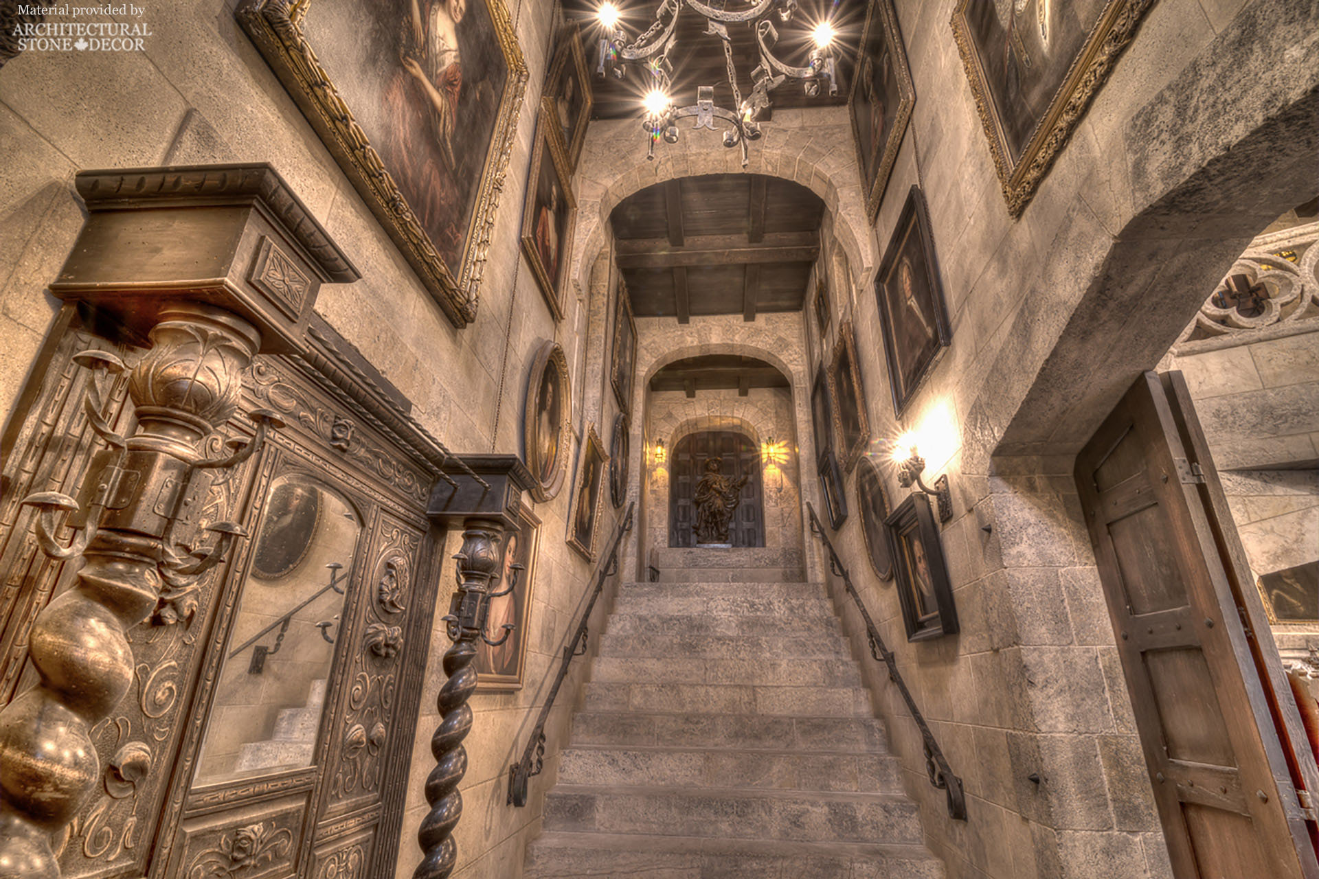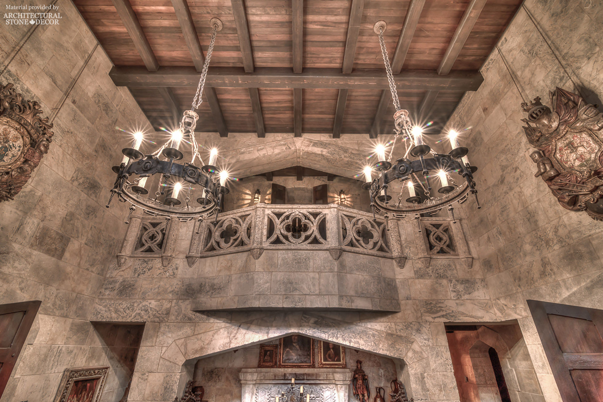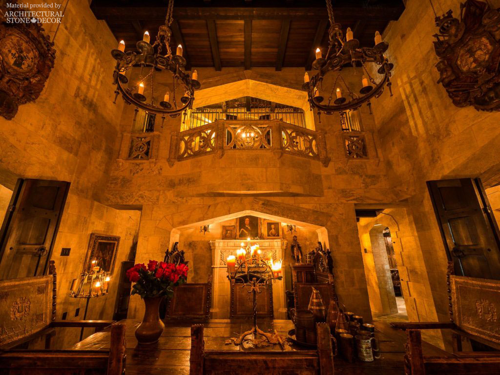 Stone Hall Castle’s Gothic Medieval styled entry hallway with reclaimed limestone ‘Barre Montpelier’ Medieval arches, stair steps and wall cladding, rustic wood doors and medieval paintings hanging on the wall bring to mind castle entrances in Game of Thrones.Reclaimed limestone ‘Barre Montpelier’ wall cladding, Medieval arches, balcony balustrades and wood ceilings with hanging metal chandeliers in this Gothic Medieval styled castle.This Gothic Medieval castle’s living room is beautifully designed with reclaimed limestone ‘Barre Montpelier’ wall cladding, Medieval arches, balcony balustrades and wood ceilings with hanging metal chandeliers. The fireplace is a reclaimed hand carved limestone art piece and the whole setting with the melting candles is strikingly similar to the ambiance of the feast room of the castle of Winterfell in Game of Thrones.