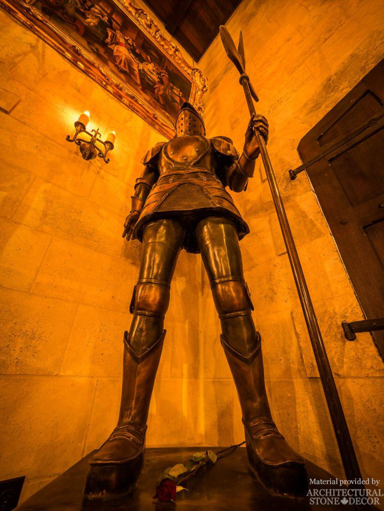 Medieval Gothic style corner with reclaimed limestone ‘Barre Montpelier’ wall cladding and an authentic full suit armor that looks like it belongs to a Westerosi knight from Game of Thrones
