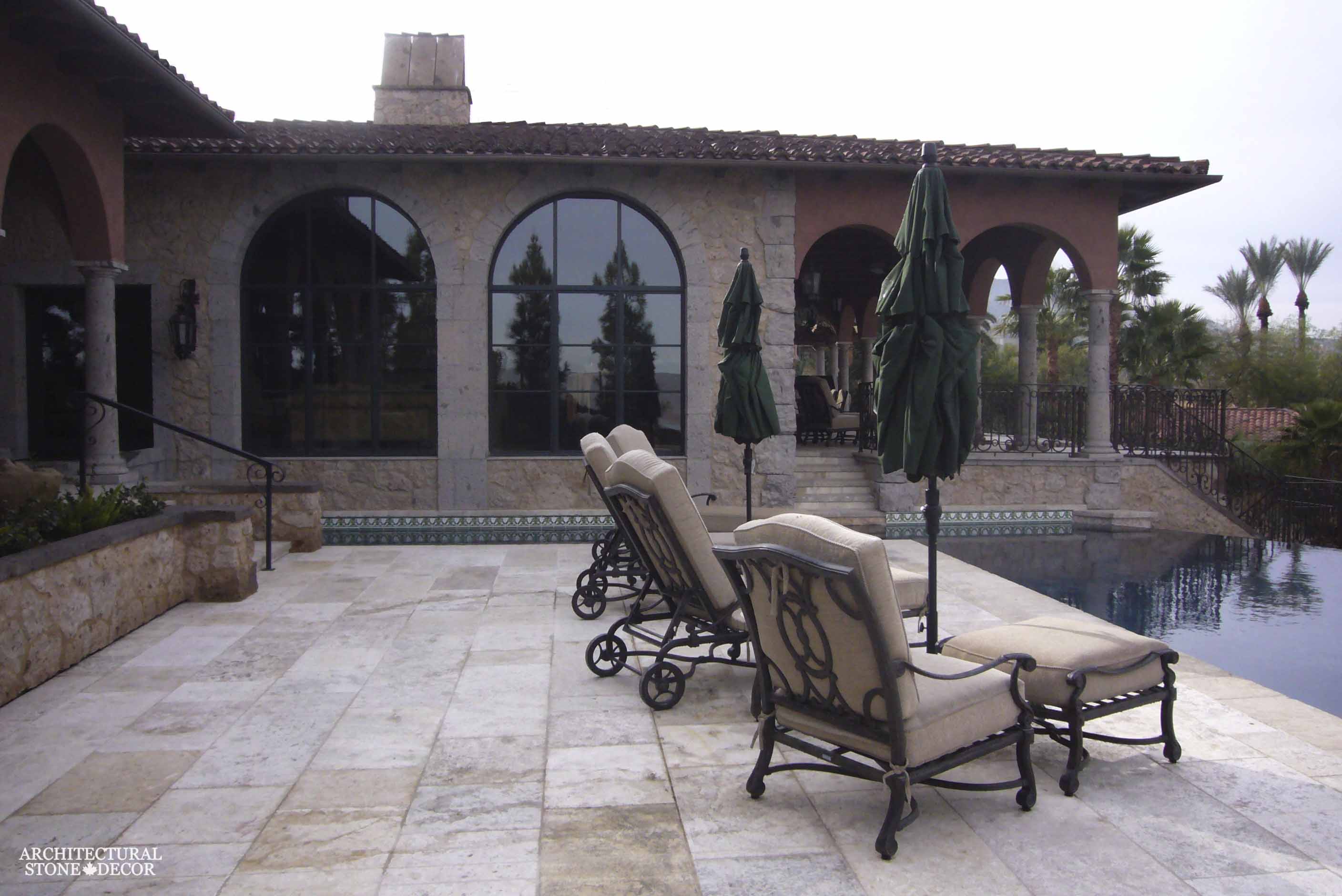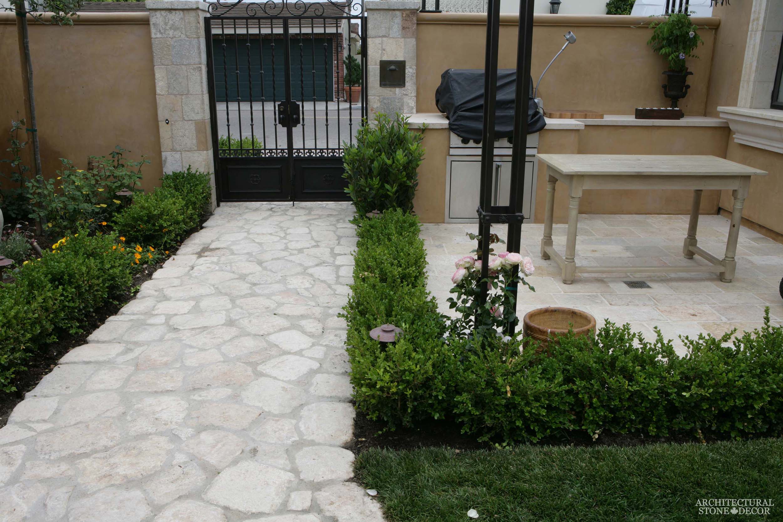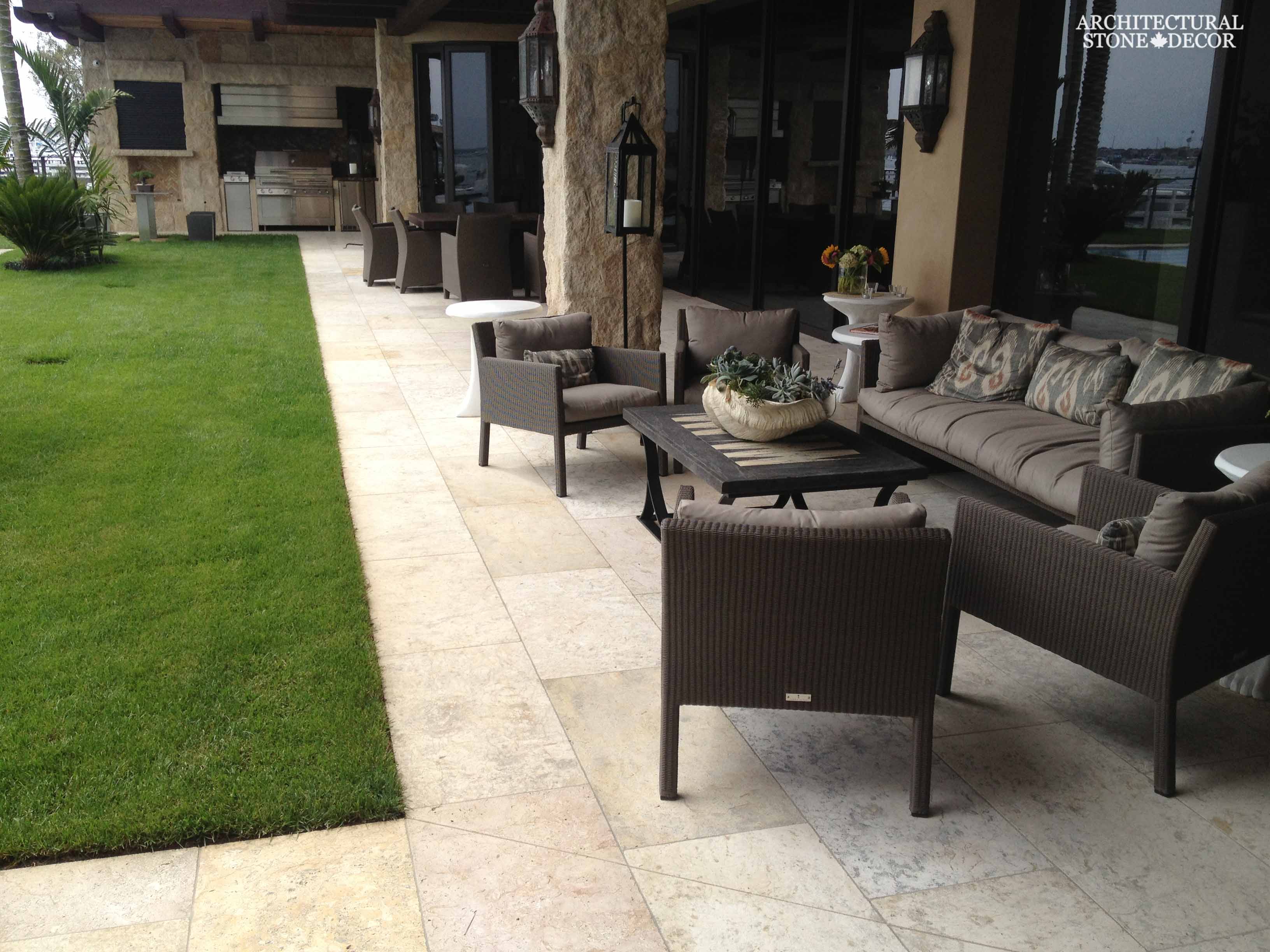 Natural limestone flooring fulfills all of these criteria. Its dense nature and texture make it durable withstanding heavy traffic and severe climate change with minimal maintenance. While its earth tones and different possibilities of installation (running bond formation or random configuration) give it an aesthetic edge compatible with almost all styles from old world, Tuscan, Mediterranean, French country to name a few.