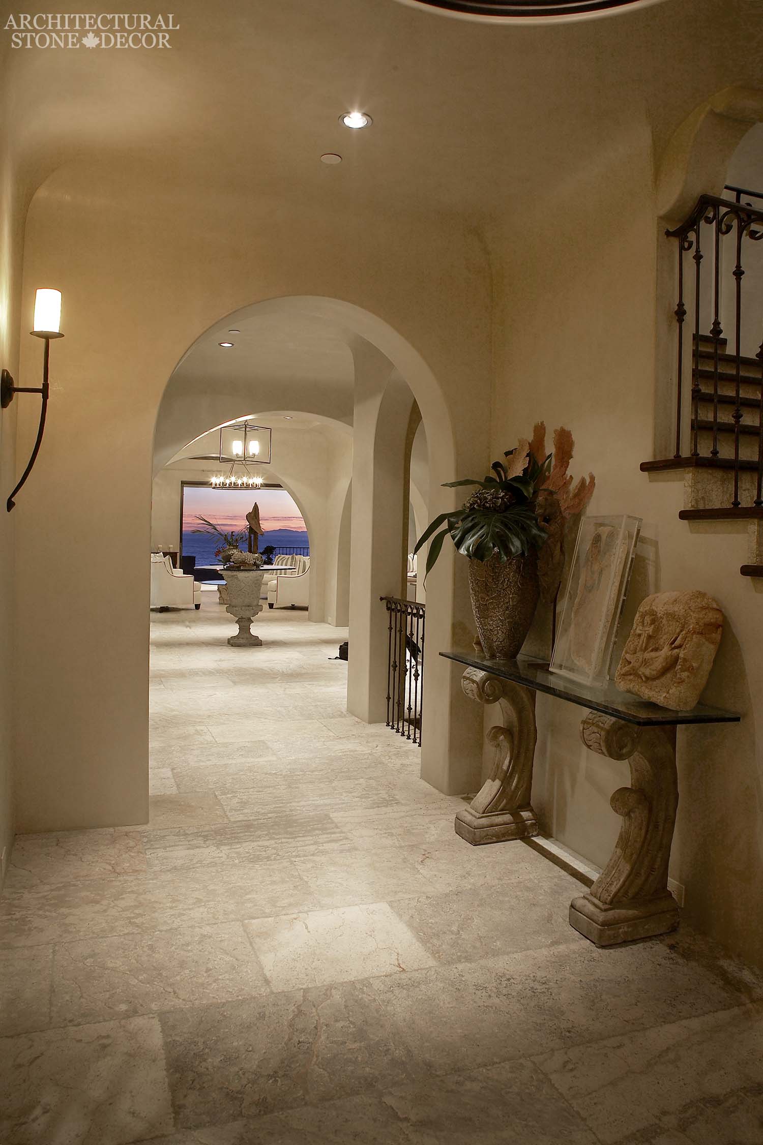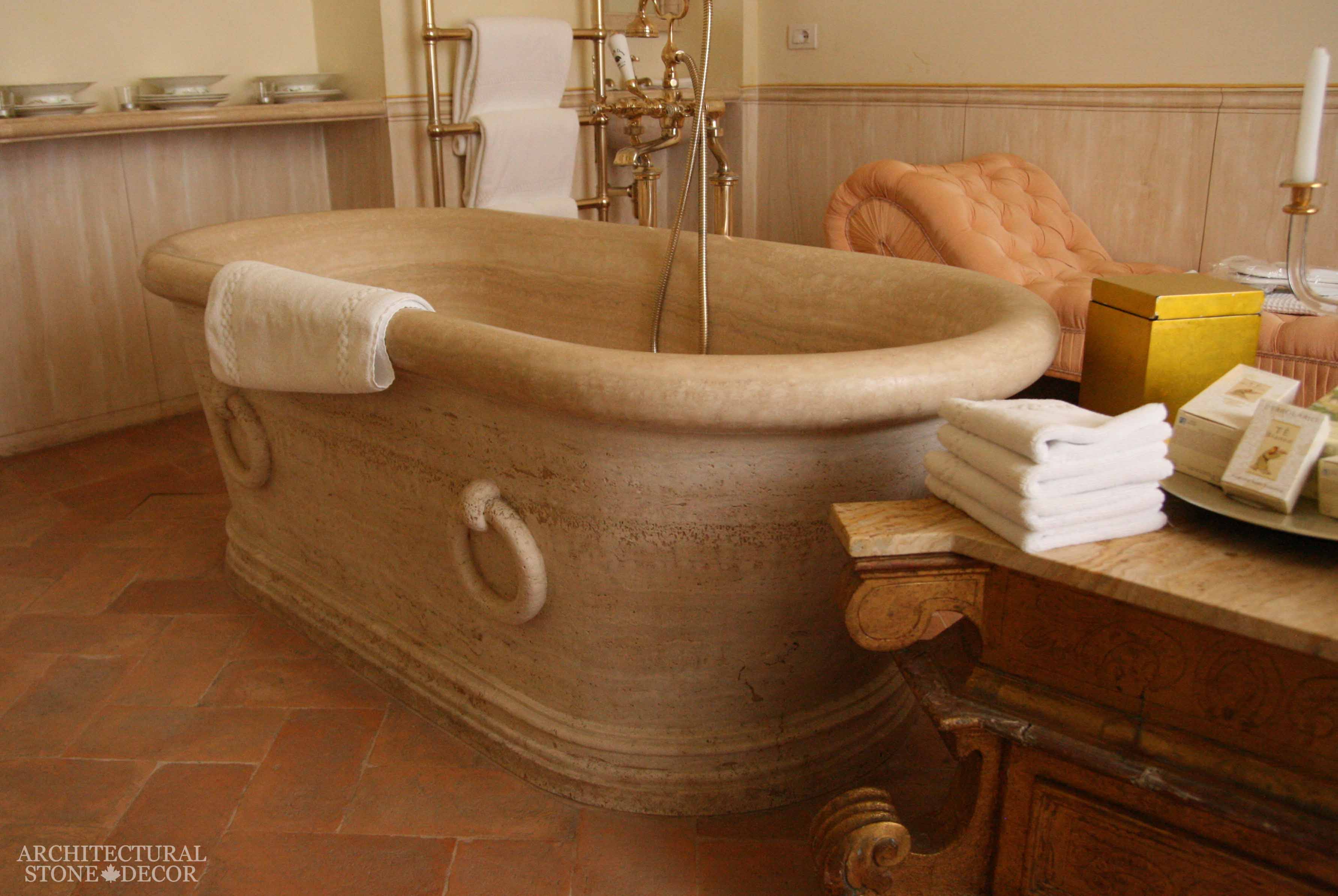 Mediterranean style hallway with reclaimed natural stone flooring, hand carved corbels for the console and center vase.Rustic limestone wall cladding in this Mediterranean styled area.Old natural Mediterranean style stone corners door surround.Mediterranean style living room with a hand carved stone fireplace mantel and limestone butcher block shelves.An Italian Mediterranean heavily carved stone fireplace mantel.An antiqued hand carved Mediterranean styled limestone fireplace mantel.A Mediterranean style living room with reclaimed stone flooring and a hand carved fireplace mantel.A Mediterranean style dining room with old stone flooring and wall cladding.A Mediterranean kitchen with a rustic hand carved limestone kitchen hood and butcher block countertop. The contrast with stainless steel provides a perfect modern touch.A Mediterranean style master bathroom with grey toned stone wall cladding, sink and shower.A Mediterranean shower with stone surround, cladding and flooring.A Mediterranean shower with multi-colored stone cladding, flooring and hand carved half egg basin and butcher block countertop.A Mediterranean style bathtub hand carved from a solid stone block ensuring leakage proof.A Mediterranean style bathroom/spa with a reclaimed limestone shower area.A Mediterranean style terrace with reclaimed old stone flooring, pool coping and wall cladding.A Mediterranean style terrace with rustic limestone flooring and fire pit.A Mediterranean garden with a hand carved natural stone wall fountain.A Mediterranean style backyard with a large hand carved limestone pool fountain.
