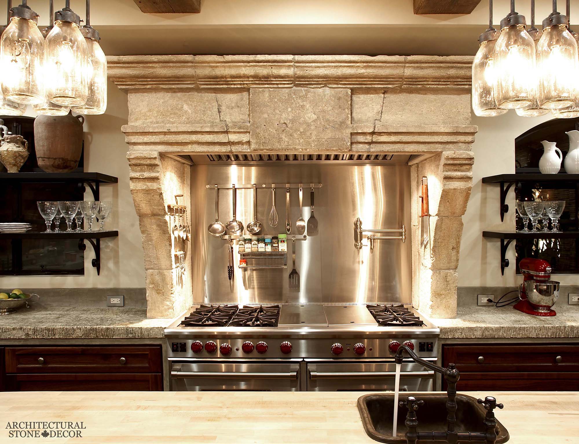 A reclaimed hand carved limestone kitchen hood can add a rustic flavor to your kitchen.