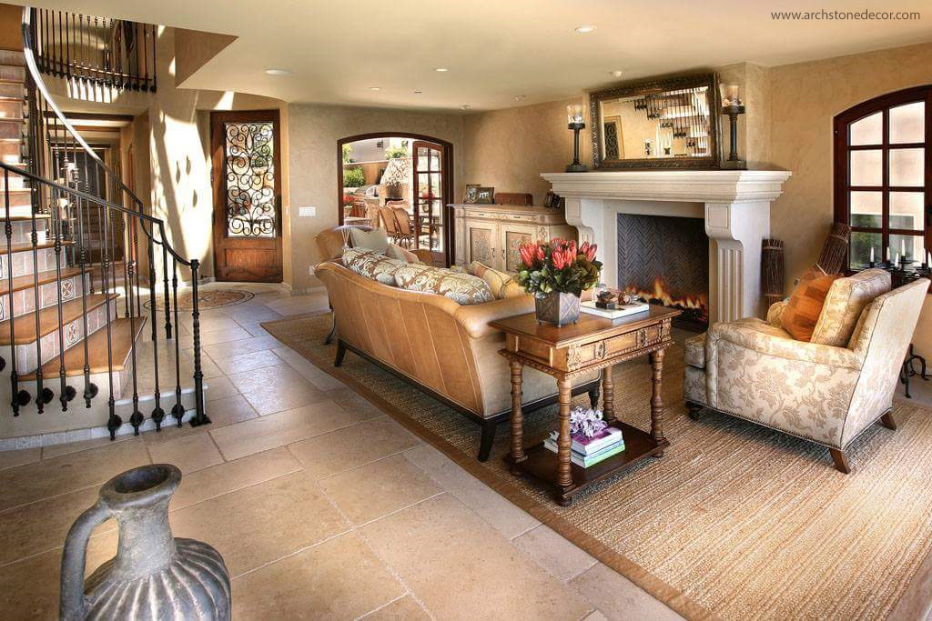 This living room combines a beautiful rustic stone mantel with old world ceiling wood beams and limestone Tuscan stone cladded archways.